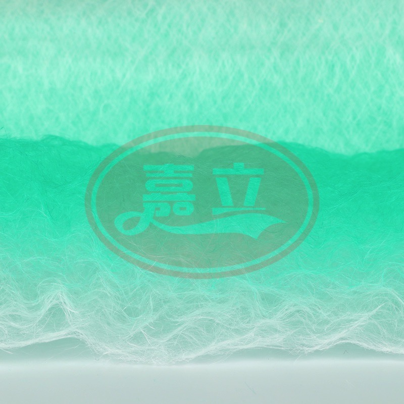 漆雾毡由高强度的连续单丝玻璃纤维组成,呈递增结构,捕捉率高、漆雾隔离效果好;压缩性能好,能保持其外型不变,其过滤纤维利于储存漆雾灰尘;漆雾毡滤料为绿白两色,绿色面为空气迎风面;具弹性、低压损,对漆雾有特佳的捕集效滤,漆雾毡阻燃符合DIN4102 F1耐温度强,可达到相对温度的耐温性; 耐高温达170。C 可切片、成卷供应。